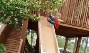 As imagens são de perder o ar. A pequena Eduarda, na época com 1 ano e 2 meses, tenta sentar no escorregador,...