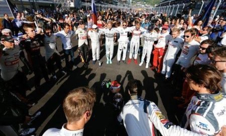 Homenagem em Sochi: pilotos se unem para orar pelo francês Jules Bianchi, internado no Japão desde o acidente sofrido em Suzuka (Valdrin...