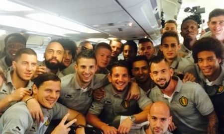 O jovem atacante do Lille, Divock Origi, mostrou os jogadores da Bélgica reunidos no avião que leva a seleção para a Copa do...