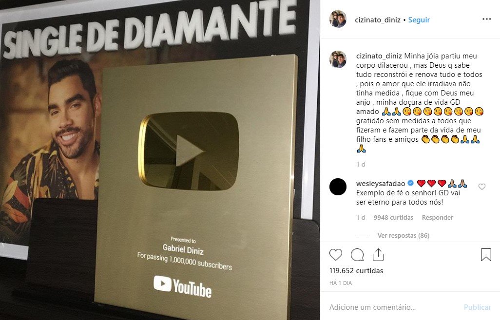 O vídeo, que já passa das 200 mil visualizações e 5 mil comentários, viralizou. Wesley Safadão comentou na publicação e agradeceu ao pai de Gabriel. “Obrigado por esse vídeo, Cizinato! Hoje foi mais um dia difícil! Sinto meu peito apertado, uma angústia, uma dor que nunca senti antes! Ver seu vídeo agora me abriu um sorriso emocionado! Deus te abençoe e te dê mais forças ainda!.”