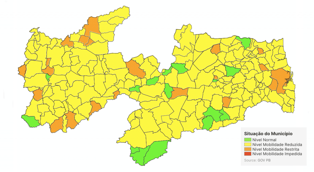 O Governo da Paraíba divulgou neste sábado (8) a 5ª avaliação do Plano Novo Normal para Paraíba, que passa a vigorar na próxima segunda-feira (10). Dos 223 municípios, 191 (86%) estão na bandeira amarela, incluindo a capital, João Pessoa, Cabedelo, Campina Grande, Patos e Guarabira; 23 municípios (10%) na bandeira laranja, incluindo Bayeux e Santa Rita e, 9 municípios (4%) na bandeira verde. A Avaliação, protocolos e notas técnicas podem ser acessados no link.