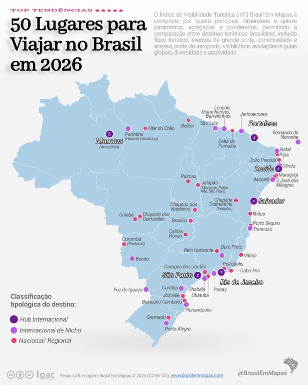 A Paraíba aparece entre os 50 Lugares para Viajar no Brasil em 2026, segundo o IVT 2026, Índice de Visibilidade Turística elaborado pelo Brasil Em Mapas. O levantamento ranqueou os destinos mais promissores do país a partir de uma metodologia que combina dados nacionais e internacionais, tendências de mídia, conectividade e fluxo turístico.