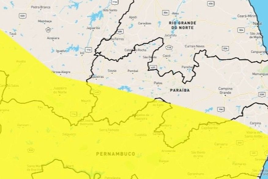 O Instituto Nacional de Meteorologia (Inmet) emitiu uma alerta nesta quinta-feira (25) sobre perigo potencial de chuvas intensas em 93 municípios paraibanos. O aviso é válido a partir das 10h deste sábado (25) até 10h deste domingo (26).