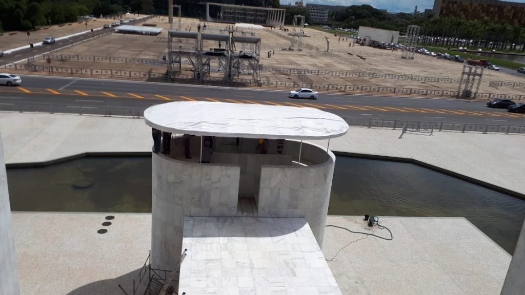 O discurso de posse do presidente Jair Bolsonaro está garantido faça chuva ou faça sol. A cobertura sobre o parlatório já foi colocada e a equipe de segurança avalia a instalação de vidros de proteção para o presidente.
