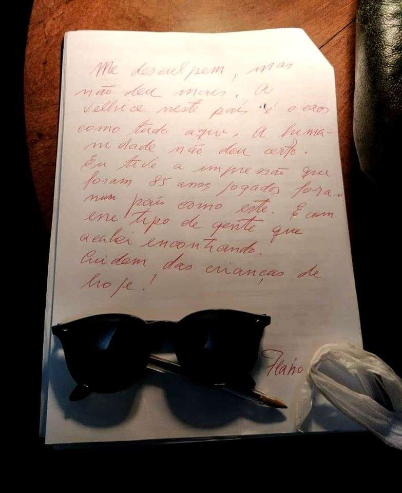 “Basta ver a carta de desespero que ele deixou, dizendo que ‘a velhice neste país é o caos como tudo aqui’ , que ‘a humanidade não deu certo’ , e que teve ‘a impressão (de) que foram 85 anos (os seus) jogados fora num país como este. E com esse tipo de gente que acabei encontrando’” , diz o segundo parágrafo da matéria.