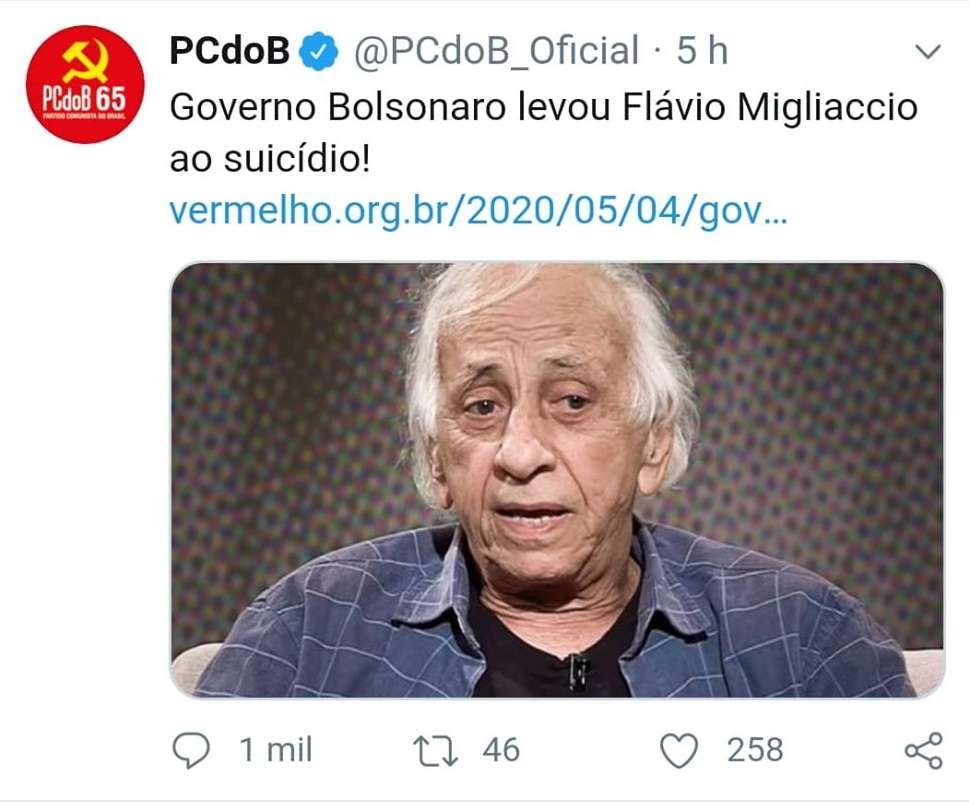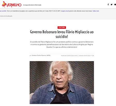 Com uma matéria intitulada: “Governo Bolsonaro levou Flávio Migliaccio ao suicídio!”, escrita pelo autointitulado ‘jornalista’, Antônio Carlos Queiroz, o portal esquerdista deixa claro a sua intenção de denegrir a imagem de Bolsonaro.
