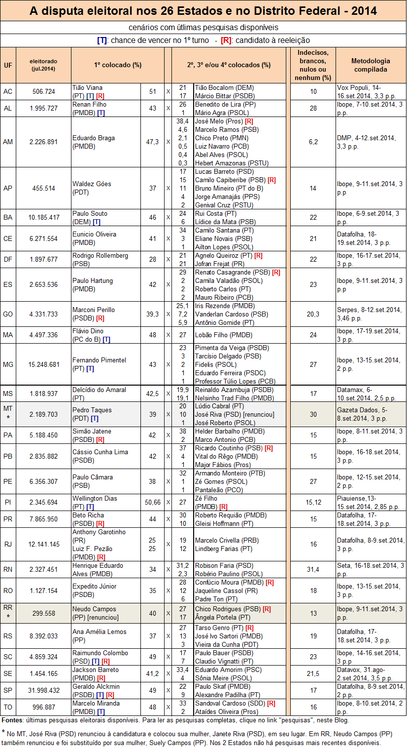 Política PESQUISAS PRA GOVERNADOR EM TODO O BRASIL Por Redação Noticiado em 23 de setembro de 2014 Notícias Relacionadas: