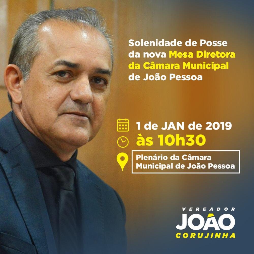 A solenidade de posse da nova Mesa Diretora da Câmara Municipal de João Pessoa foi marcada para acontecer na próxima terça-feira, 1º de janeiro. O vereador João Corujinha deve assumir a presidência da casa durante sessão programada para as 10h30 no Plenário da Câmara.