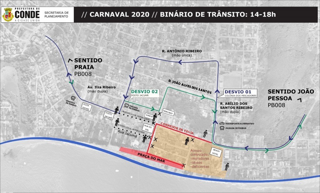 Binário – O fluxo de veículos será operado por um binário, que funcionará sempre das 14h às 18h, enquanto os blocos estiverem desfilando pela Avenida Ilza Ribeiro (Corredor da Folia). O condutor que estiver fazendo o sentido João Pessoa/Praias (Jacumã, Carapibus, Tabatinga, etc.), ao chegar no Beach Hotel, deverá na rua Abílio dos Santos Ribeiro em seguida na rua Antônio Ribeiro (via de mão única), depois na rua Etelvina do Nascimento e acessar a PB-008. No sentido contrário, o condutor deverá virar à esquerda na rua Etelvina Nascimento, em seguida na rua José Miguel dos Santos, passando na rua Dez de Janeiro, rua João Alves dos Santos até chegar na Rua Abílio dos Santos Ribeiro e acessar novamente a PB 008. Medidas de restrição de estacionamento nas áreas do binário serão tomadas e sinalizadas para este fim.
