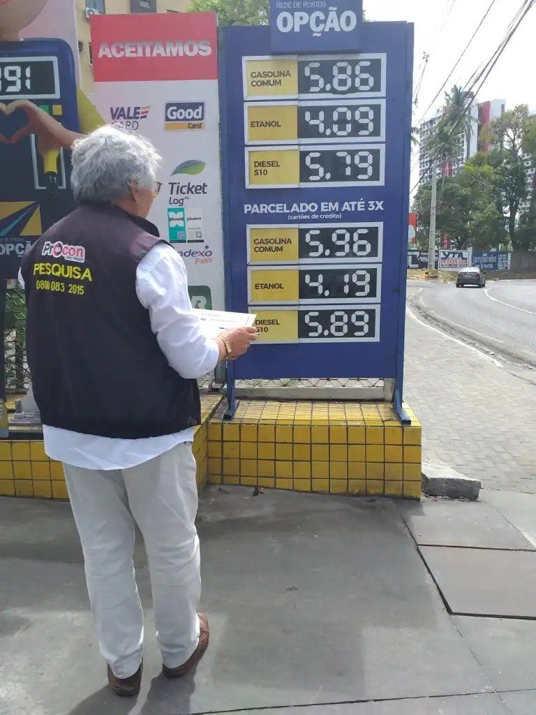 O preço médio da gasolina comum, isto é, considerando a média praticada entre os 115 estabelecimentos pesquisados pelo Procon-JP, é de R$ 5,85, para pagamentos em dinheiro; e R$ 5,94, no cartão de crédito.