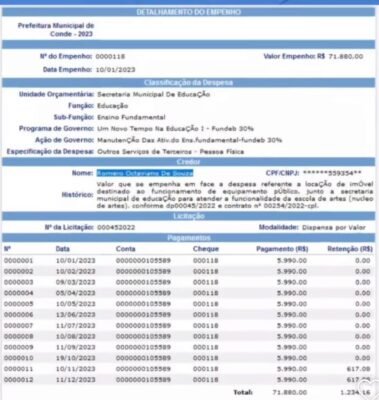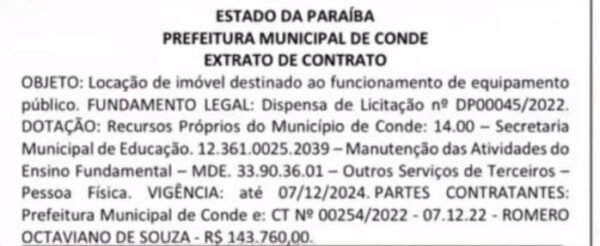 O contrato firmando entre Prefeitura de Conde e proprietário do espaço foi assinado em dezembro de 2022. O preço mensal do aluguel é de R$ 6 mil. um levantamento feito, apontou que a Prefeitura de Conde Já pagou R$ 72 mil, sem utilizar o espaço.