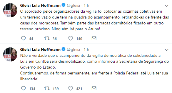 Gleisi Hoffmann também confirmou no Twitter que não vai cumprir o acordo de transferência do acampamento em frente à PF.