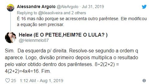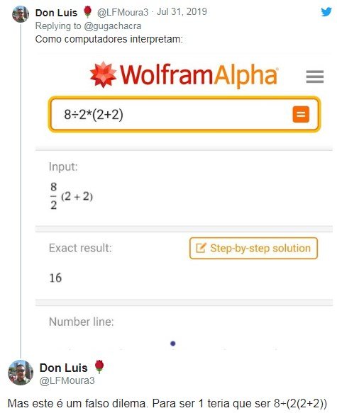 Mas, afinal, tem reposta certa? Tem. E segundo o matemático e professor do Departamento de Estatística da Universidade de Brasília (UnB) Jhames Matos Sampaio, as duas estão corretas. “Existe uma ambiguidade na questão. O ponto fundamental para resolver a equação é saber a intenção do calculante. O objetivo é dividir o 8 por toda a expressão? Se sim, o resultado é 1. Se não, é 16”, explicou.