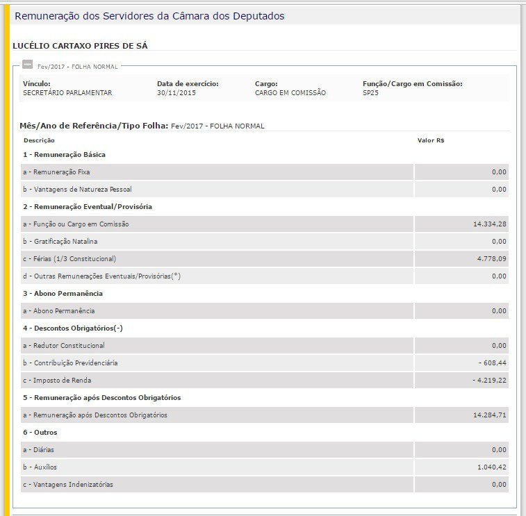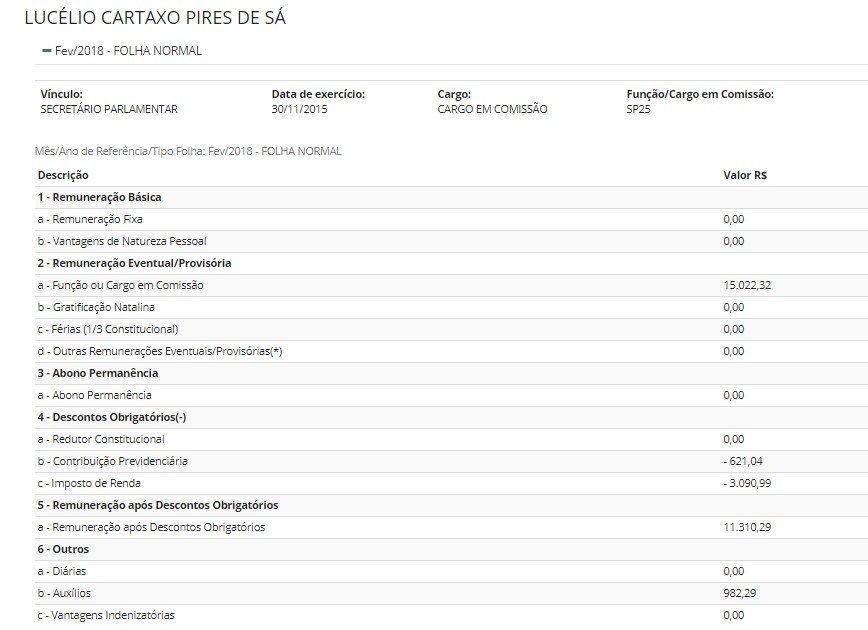 Conforme o portal da Câmara, ainda no mês de fevereiro deste ano Lucélio recebeu remuneração, no valor de R$ 11,3 mil. Os dados de março constam como indisponíveis.