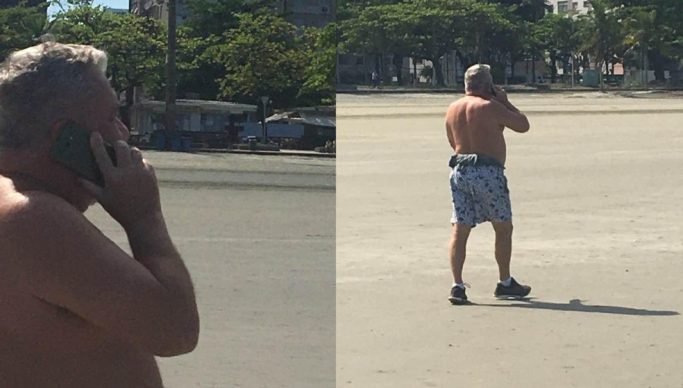 O registro foi feito na manhã desta quarta-feira (5), segundo a moradora, que prefere não se identificar. Ela relata que o desembargador estava caminhando pela faixa de areia, com a máscara no pescoço, enquanto falava ao celular, do Canal 4 até o Canal 5. A cena durou cerca de 20 minutos. “Passou a Rua General Rondon, avistou uma viatura da GCM, deu meia volta e colocou a máscara”, descreve.