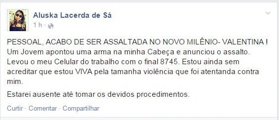 De acordo com postagem feita pela própria Aluska em uma rede social, um jovem apontou uma arma em sua cabeça e anunciou o assalto, levando o aparelho do seu telefone celular institucional.