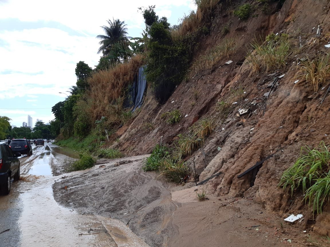 Por conta das chuvas em João Pessoa, parte da barreira localizada no Km 18 da BR-230 sentido Cabedelo cedeu e invadiu a pista.