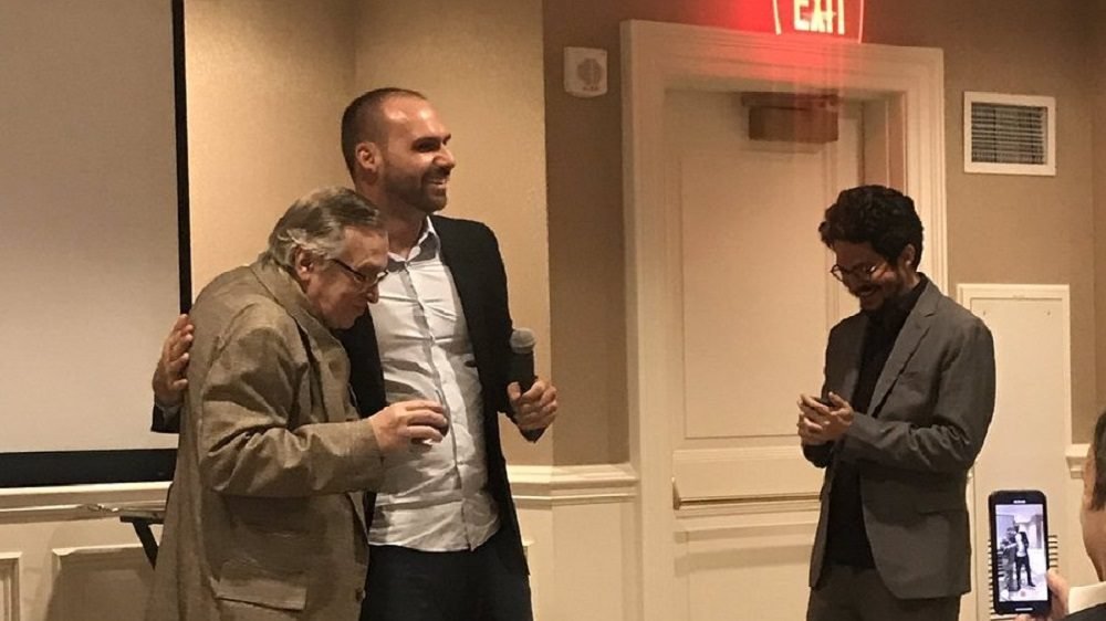 O deputado Eduardo Bolsonaro, líder do Comitê de Relações Exteriores da Câmara, também não economizou elogios ao Olavo de Carvalho, “uma das pessoas mais importantes da História do Brasil”. “Olavo de Carvalho é uma inspiração e sem ele Jair Bolsonaro não existiria”, disse Eduardo, que assistiu concentrado aos cerca de 1h20 de filme.