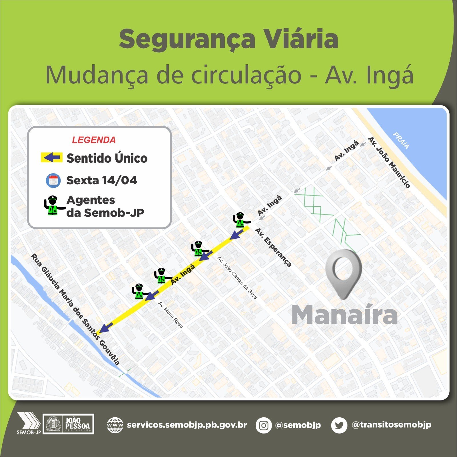 A Superintendência Executiva de Mobilidade Urbana de João Pessoa (Semob-JP) divulgou, que a partir desta sexta-feira (14), o trânsito da Capital sofrerá alterações. A mudança de circulação ocorre em um trecho da Avenida Ingá, em Manaíra.