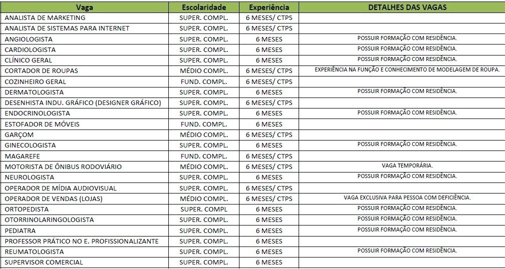 Confira as vagas na tabela