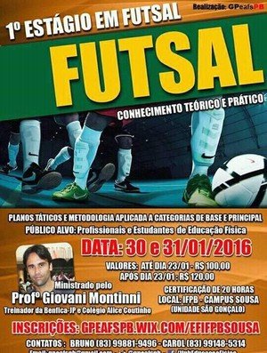 Os desportistas da cidade de Sousa vão ter a oportunidade de ampliar seus conhecimentos sobre o futsal. O 1º Estágio em Futsal é um evento onde são discutidos conhecimentos teóricos e práticos sobre a modalidade sob a condução do treinador Giovani Montinni, um dos principais comandantes do futsal na Paraíba, com passagem pelo Benfica de João Pessoa e atual técnico do Colégio Alice Coutinho, de Campina Grande, referência na formação de atletas para o esporte.