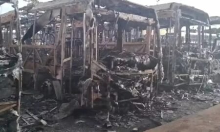 Cinco ônibus ficaram completamente destruídos durante um incêndio iniciado na madrugada desta quarta-feira (17), na garagem da empresa Nossa Senhora Aparecida, no...