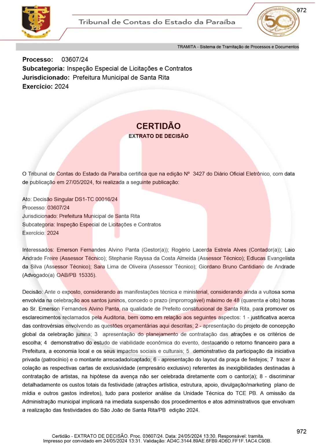 “Ante o exposto, considerando as manifestações técnica e ministerial, considerando ainda a vultosa soma envolvida na celebração aos santos juninos, concedo o prazo (improrrogável) máximo de 48 (quarenta e oito) horas ao Sr. Emerson Fernandes Alvino Panta, na qualidade de Prefeito constitucional de Santa Rita, para promover os esclarecimentos reclamados pela Auditoria”, diz o conselheiro na decisão.