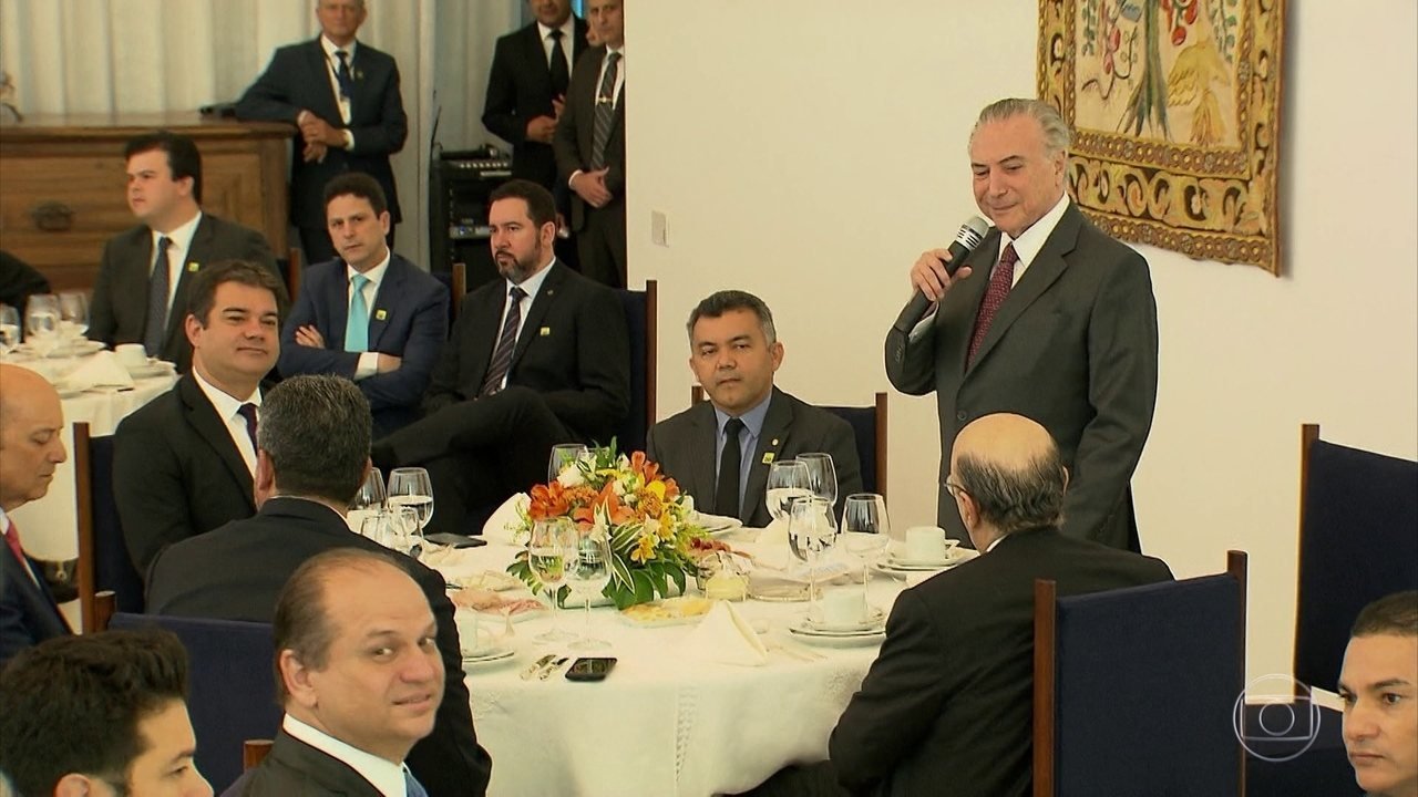 Participam do café ministros como o da Casa Civil, Eliseu Padilha, e do Planejamento, Dyogo Oliveira. Dentre os parlamentares estão os deputados Baleia Rossi (PMDB-SP), Aguinaldo Ribeiro (PP-PB), Celso Russomanno (PRB), André Moura (PSC-SE), Arthur Maia (PPS-BA) e Darcísio Perondi (PMDB-RS).