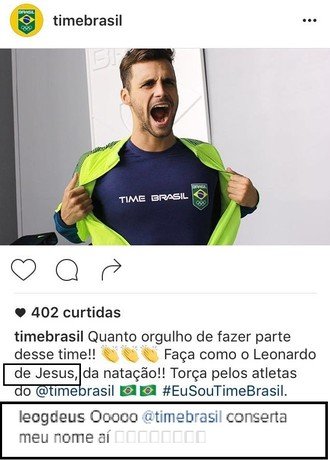 Uma publicação de rotina com o objetivo de inflamar os torcedores brasileiros às vésperas da abertura dos Jogos Olímpicos Rio 2016 acabou se tornando uma gafe nas redes sociais. O perfil oficial do Time Brasil postou uma foto do nadador Leonardo de Deus, mas se confundiu ao escrever o sobrenome. O próprio atleta, nos comentários, se manifestou e pediu a correção.
