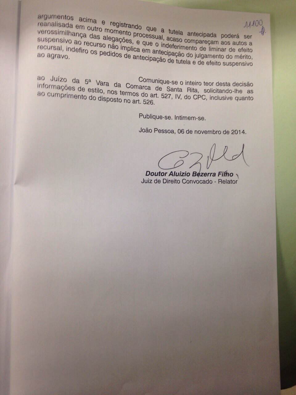 Aluízio Bezerra disse, ainda, que os argumentos apresentados não são fortes o suficiente para reverter a decisão e devolvê-lo à prefeitura. “Os mais fortes argumentos do agravante encontram obstáculo na prova que o próprio recorrente utilizou para instrução processual do agravo, e as demais supostas realidades, relativas a falhas na tramitação dos processos administrativos, de ordem interna da Câmara Municipal de Santa Rita, demandam, inegavelmente, dilação probatória, como já vem ocorrendo nos autos da ação principal anulatória”, acrescentou.