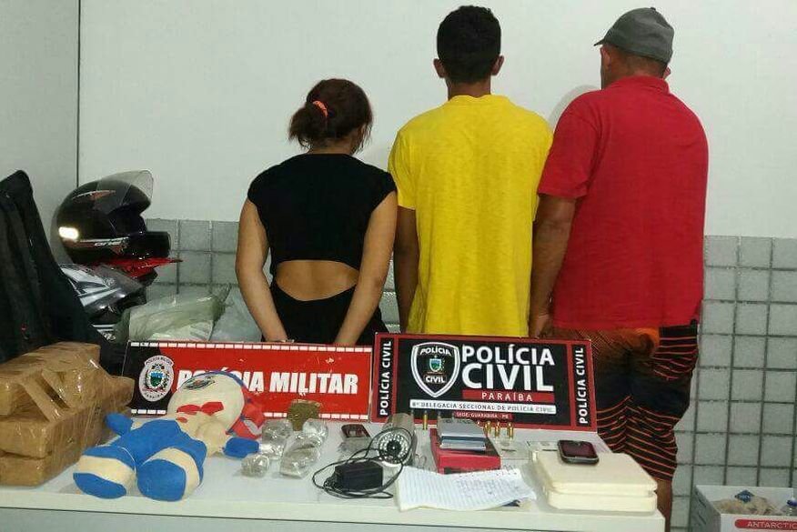 Dois homens e uma mulher foram presos por policiais militares e civis nesta quarta-feira (12), nas cidades de Guarabira e Pilõezinhos, acusados de tráfico de drogas, posse ilegal de arma e associação criminosa. Com eles foram apreendidos 5,450 kg de uma substância semelhante à maconha, sendo 450g dentro de um palhaço de pelúcia do personagem infantil Patatá, 14 munições calibre 380, duas balanças de precisão e um caderno de anotações com informações sobre a distribuição da droga.