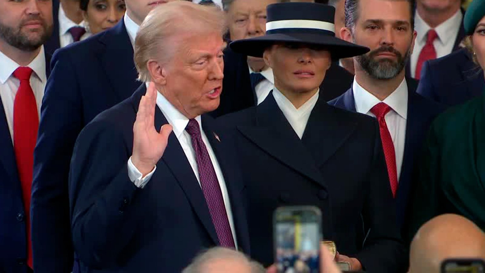 Ao lado do vice-presidente eleito, JD Vance, Trump fez o juramento para o cargo perante o chefe da Suprema Corte, John Roberts, ao meio-dia (horário de Washington, D.C., 14h em Brasília). Após a posse, o presidente fez seu discurso inaugural, demonstrando sua visão para o futuro do país. A fala do presidente foi feita no mesmo tom que marcou sua campanha eleitoral.