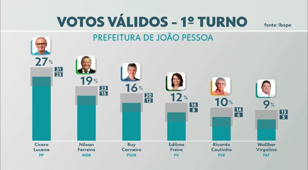 Pesquisa Ibope divulgada pela TV Cabo Branco neste sábado (14) aponta os seguintes percentuais de intenção de votos válidos para a Prefeitura de João Pessoa nas Eleições 2020: