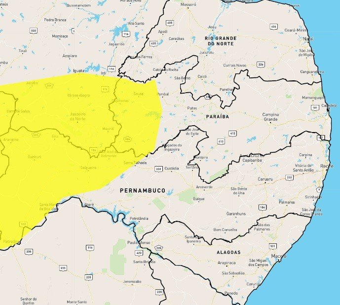 O Instituto Nacional de Meteorologia (Inmet) colocou 52 municípios do Sertão da Paraíba sob alerta amarelo (perigo potencial) de baixa umidade do ar. O índice deve variar entre 20% e 30% nesta quinta-feira (12). A baixa umidade do ar pode provocar danos à saúde humana e também incêndios florestais.