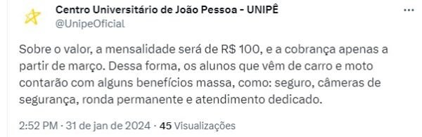 “Dessa forma, os alunos que vêm de carro e moto contarão com alguns benefícios massa, como: seguro, câmeras de segurança, ronda permanente e atendimento dedicado”, diz a publicação.