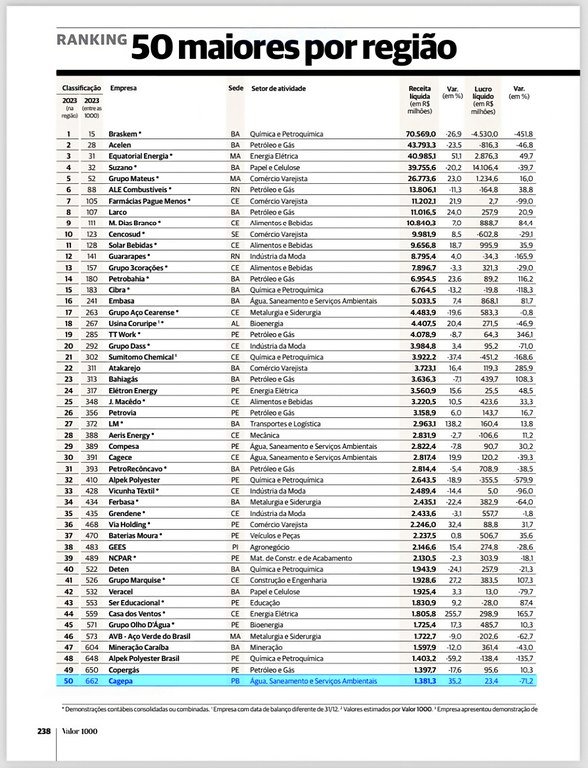 Entre públicas e privadas, a Companhia de Água e Esgotos da Paraíba (Cagepa) é a maior empresa do Estado e a 50ª maior do Nordeste, de acordo com o anuário Valor 1000, do jornal Valor Econômico. A publicação elenca e analisa o desempenho das mil maiores empresas do Brasil em seus setores de atuação. Com uma receita líquida de R$ 1.381,3 milhões, a Cagepa subiu 142 posições no ranking, do ano anterior para este.