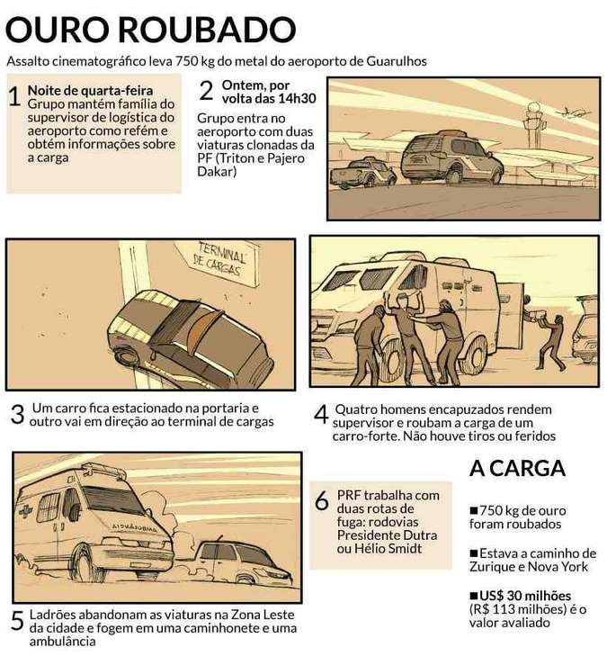 Portando fuzis, pistolas e carabinas, o grupo entrou no armazém em dois veículos disfarçados como viaturas da Polícia Federal e abordou os agentes do terminal de cargas. Os metais preciosos seguiriam para Zurich e Nova York. De acordo com a concessionária, não houve tiroteio ou feridos. Os criminosos fugiram e, até a noite de ontem, ninguém tinha sido preso.
