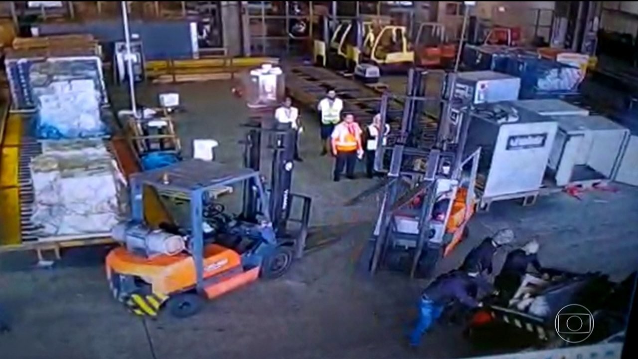 As imagens de câmeras de segurança mostraram o momento em que uma das caminhonetes com identificação da Polícia Federal chegou ao local onde o produto estava sendo manuseado. Cinco pessoas, desceram do veículo. Quatro homens vestiam roupas pretas, capuzes e portavam armas. O quinto aparentava ser um funcionário do terminal.