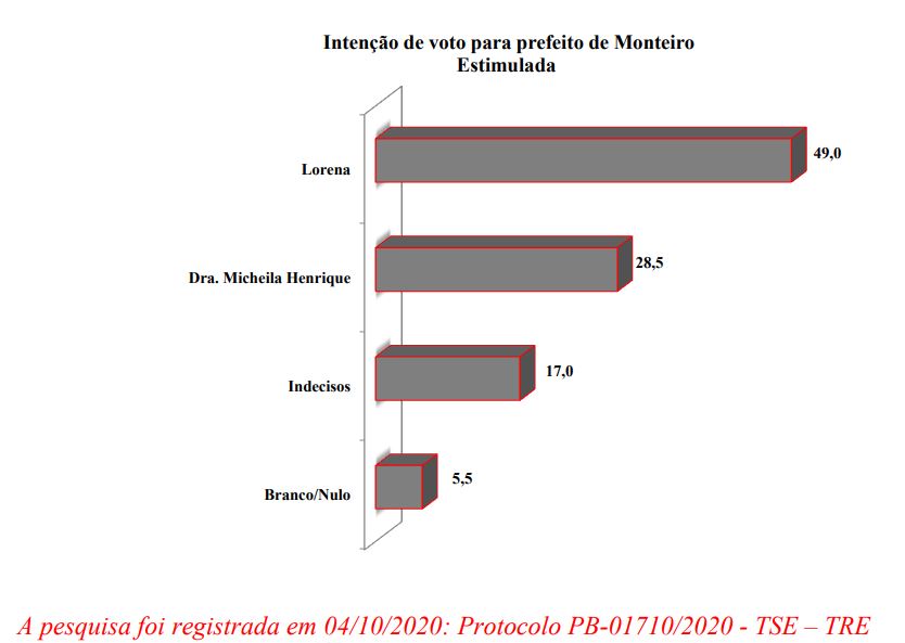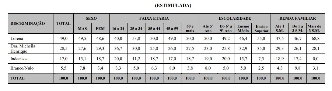 Na primeira pesquisa registrada em 04 de outubro, Lorena venceria a adversária Micheila Henrique com 20,5% de vantagem. Os primeiros números apontaram uma votação de 49% da atual prefeita contra 28,5% de sua adversária.