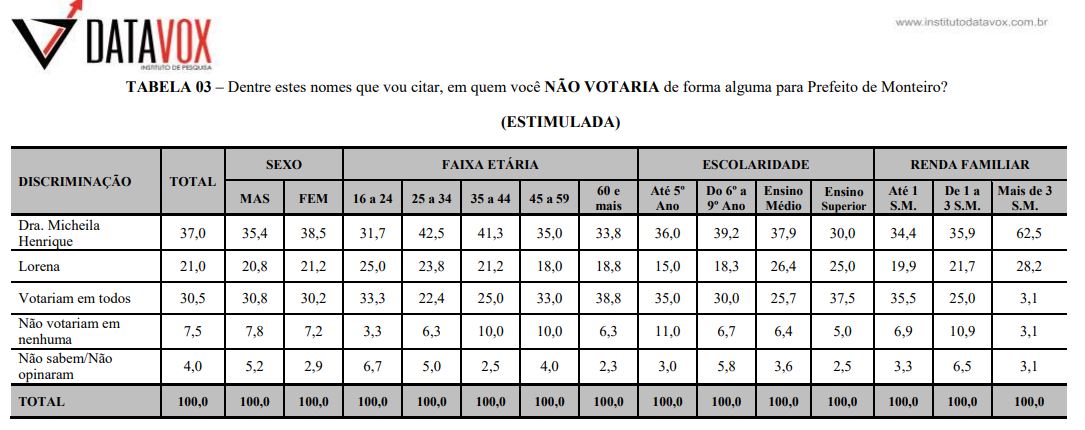 Sobre a pesquisa – A pesquisa Datavox foi registrada no Tribunal Regional Eleitoral no dia 04 de outubro de 2020 com o Protocolo PB-01710/2020 – TSE – TRE. As entrevistas foram realizadas no dia 05 de outubro de 2020 e ouviu 400 pessoas com mais de 16 anos.