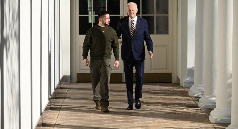 Vestindo uniforme militar marrom em vez de terno, Zelenski foi levado a Washington, onde Biden, acompanhado da primeira-dama, Jill Biden, pôs o braço em seu ombro antes de conduzi-lo pela porta em que guardas seguravam as bandeiras americana e ucraniana.