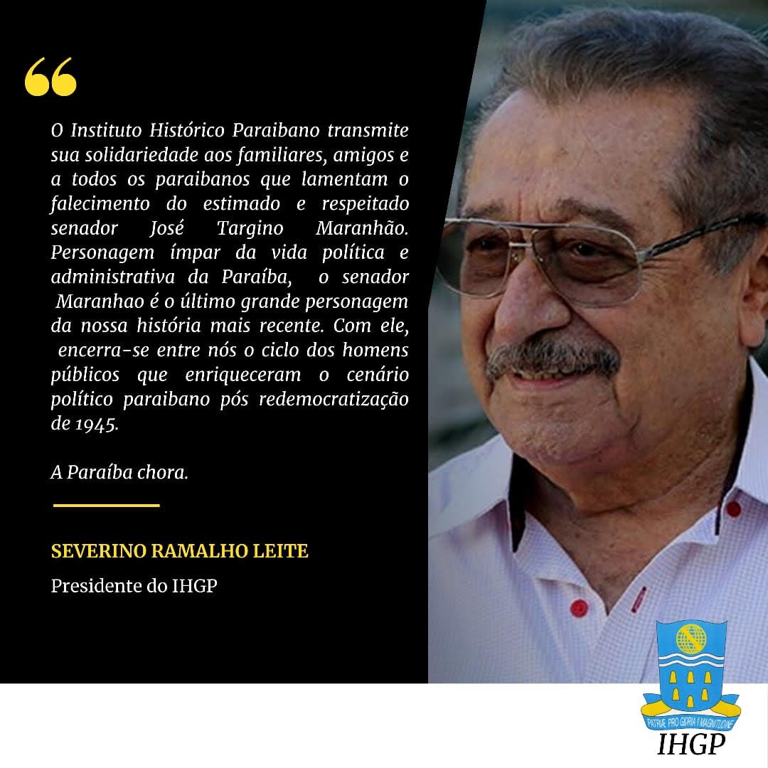 O Instituto Histórico Paraibano transmite sua solidariedade aos familiares, amigos e a todos os paraibanos que lamentam o falecimento do estimado e respeitado senador José Targino Maranhão. Personagem ímpar da vida política e administrativa da Paraíba, o senador Maranhao é o último grande personagem da nossa história mais recente. Com ele, encerra-se entre nós o ciclo dos homens públicos que enriqueceram o cenário político paraibano pós redemocratização de 1945. A Paraíba chora.